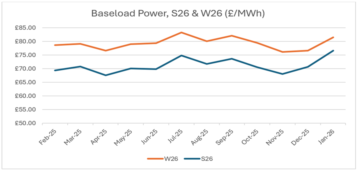 Increased storage withdrawals over January see EU storage drop to 45% fullness, 11% lower than last year. In addition, a cold snap in the US saw a reduction in LNG output towards the end of January. Only 36 LNG cargos to arrive in Europe this February, compared to 110 received last year. Summer26 contracts are pushed up further to meet the demand to replenish storage. Though this concern was short-lived, as revised forecasts see US LNG output ramp up once again from start of February.