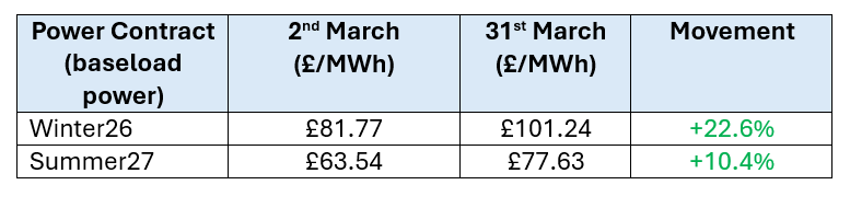 Chaos continues in the UK gas and power markets. Continued conflict in the Middle East is driving instability in global energy markets, with major energy facilities damaged. The Strait of Hormuz was impassable for much of March, resulting in unprecedented market volatility and increasingly constrained LNG gas supply globally. Ongoing negotiations have provided some relief in the markets. UK gas prices have doubled since the outbreak of the conflict, impacting all contracts and establishing a new price range.